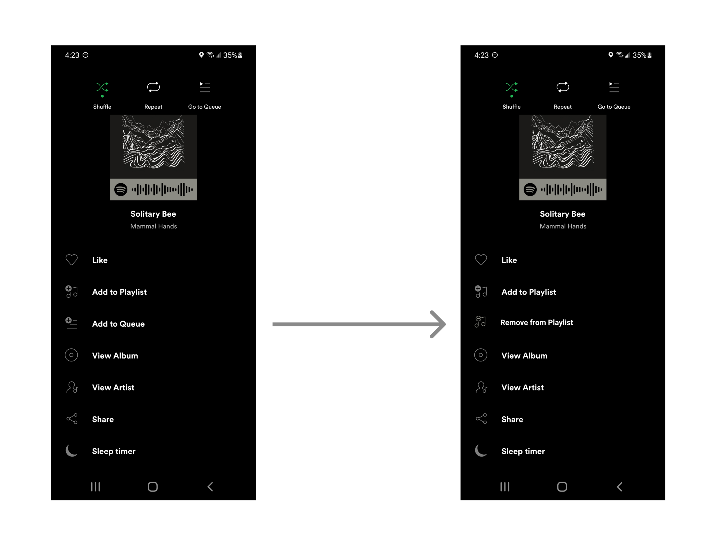 The option to Remove from Playlist could also be easily inserted into the More Options menu for Now Playing. Here I’ve replaced Add to Queue, but all possible tasks for a song could remain available in this menu.